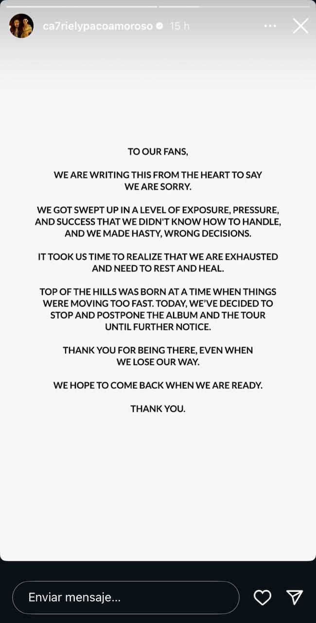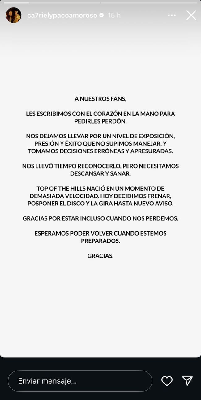 En el mensaje, los artistas señalaron que la pausa permitirá corregir errores. IG/ca7rielypacoamoroso