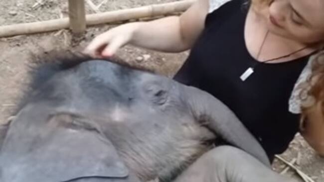 Un video muestra cómo un elefante bebé duerme plácidamente en el regazo de una mujer que lo arrulla con canciones de cuna.