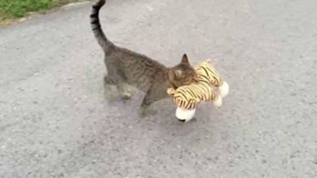 ¿Por qué este gato se robó un tigre de peluche?
